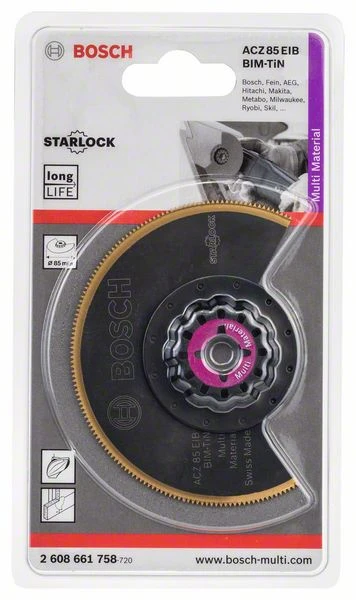 Produkteigenschaften:Das titanbesetzte Segmentsägeblatt Starlock ACZ 85 EIB hat im Vergleich zu unbesetzten Blättern aus Bimetall eine um 30 % höhere Lebensdauer. Die mit TiN (Titannitrid) besetzten Zähne sind ausgesprochen hitze- und verschleißresistent und gewähren eine überdurchschnittlich lange Nutzungsdauer. Die mit der patentierten Rundschweißtechnologie von Bosch hergestellten Zähne sind robust und freistehend. Sie verhindern Verklemmen und Hitzespuren und ermöglichen eine verlängerte Nutzung. Geeignet für Tauchschnitte in Gipskartonplatten, Zementfaserplatten, Holz, ungehärtetes Metall, kleinere Profile, glasfaser- oder epoxidharzverstärkte Kunststoffe. Mit den Sägeblattspitzen lassen sich schwer zugängliche Ecken erreichen. Das Starlock-Aufnahmesystem ermöglicht einen schnellen Blattwechsel ohne Blattberührung in drei Sekunden. Das Aufnahmesystem ermöglicht durch seine dreidimensionale enge Passung maximale Kraftübertragung zwischen Maschine und Zubehör. Das Blatt ist kompatibel mit allen Elektrowerkzeugen des Typs Starlock, Starlock Plus und Starlock Max sowie allen gängigen Multifunktionswerkzeugen.Technische Daten:Durchmesser [mm]: 85Lieferumfang:1x Bosch BIM-TiN Segmentsägeblatt ACZ 85 EIB Multi Material 85 mm