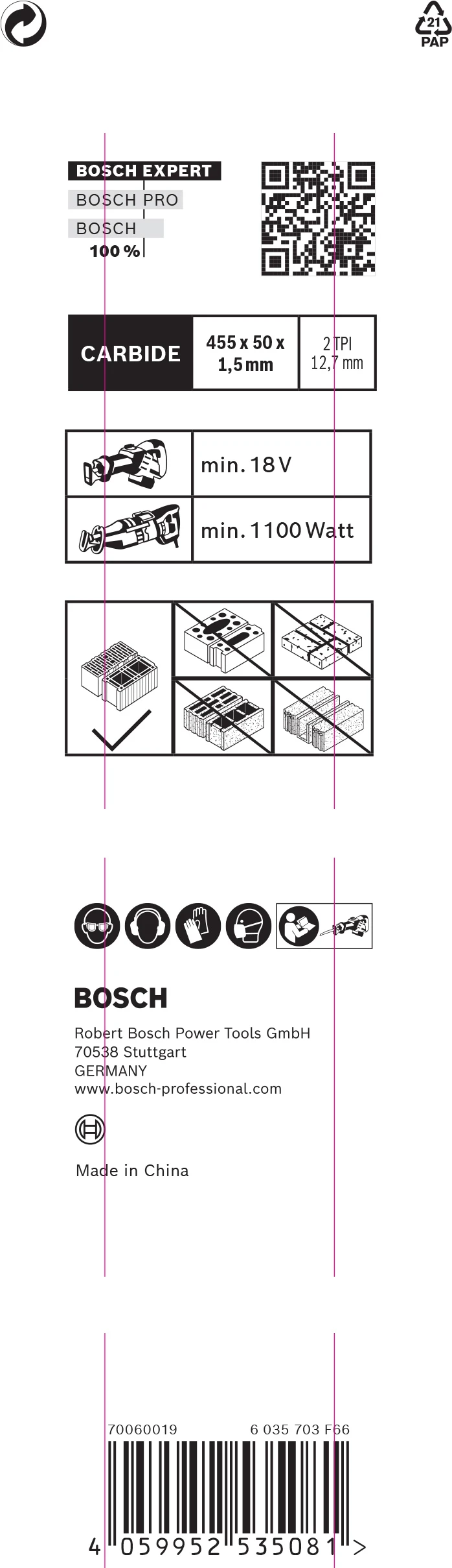 Ideal zum Schneiden von Hohlziegeln während Bauarbeiten, zum Beispiel zum Schneiden eines großen Hohlziegel-Blocks, um ihn in eine Wand einzupassen, oder um einen Ausschnitt in einer Ziegelwand vorzunDie erste Wahl für Handwerker: langlebig und leistungsstark.Produkteigenschaften:Schneidet Materialien, bei welchen andere Blätter scheitern – Handwerker und Maurer können durch das Schneiden von Hohlziegeln vor Ort ihre Arbeit beschleunigen und produktiver gestalten.Die meisten Säbelsägeblätter konnten jedoch in solchen abrasiven Mineralmaterialien nicht lange standhalten.Mit einem speziellen Carbide-Blatt wie dem Expert ‘Hollow Brick’ können Maurer Hohlziegel bequem zuschneiden, ohne ihre Blätter zu zerstören.Um Aufgaben zu übernehmen, die herkömmliche Bimetall-Säbelsägeblätter nicht erfüllen konnten, wurde für das Bosch Expert ‘Hollow Brick’ Säbelsägeblatt die Bosch Carbide Technology verwendet.Es wurde speziell zum Schneiden von Hohlziegeln entwickelt.Sein breiter Körper und seine dicke Stärke sorgen für Stabilität, damit Handwerker einen präzisen Schnitt ausführen können.Die hartgelöteten Carbide-Zähne sind robust genug, um den ganzen Tag Ziegel zu schneiden.Das Bosch Expert ‘Hollow Brick’ Säbelsägeblatt macht die Säbelsäge schnell zu einem bevorzugten Werkzeug unter Maurern.Schneide deine Steine mit der Bosch Carbide Technology zu.Passend auf alle Säbelsägen mit S-Schaft.Technische Daten:Zahnteilung [mm] / TPI: 12,7 / 2Gesamtlänge [mm]: 455Gesamtlänge [Zoll]: 18Breite [mm]: 50Dicke [mm]: 1,5Werkstoff: CARBIDELieferumfang:1x Bosch EXPERT Hollow Brick S 2243 HM Sägeblatt, 1 Stück