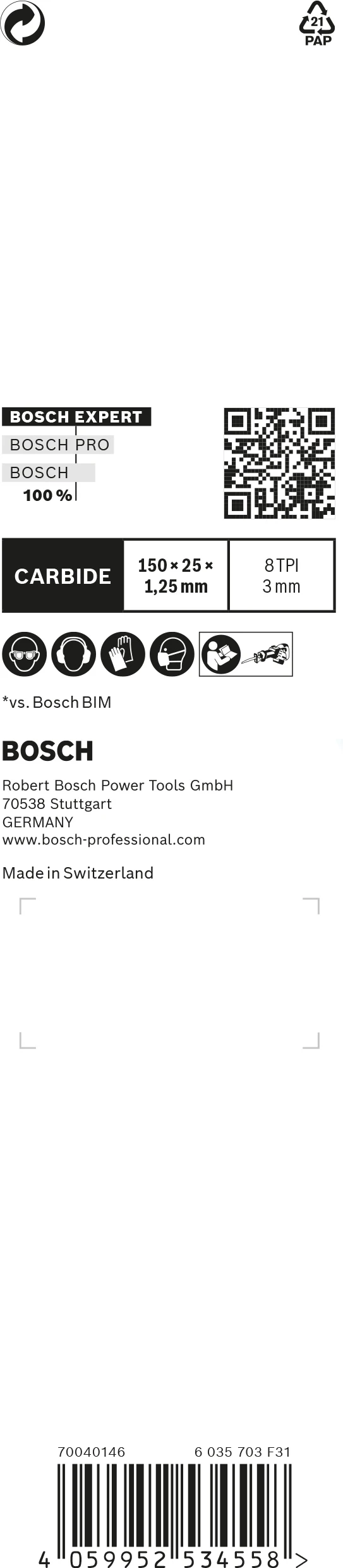 Ideal zum Schneiden von dickem, zähem Metall wie: Gusseisenrohr wie etwa Hauptwasserleitungen. Hochlegierter Stahl im Bauwesen und hochfester Stahl.Die erste Wahl für Arbeiter in Versorgungsunternehmen: langlebig und leistungsstark.Produkteigenschaften:Hält bis zu 100-mal länger als ein Bimetall-Blatt in robustem Material – Das Schneiden durch dickes Metall wie Stahlprofile oder schwere Gussrohre gehört wahrscheinlich nicht zu deinen Lieblingsarbeiten.Sanitärinstallateure, Renovierer und Abbrucharbeiter wissen alle, dass für diese harte Arbeit selbst mit einer Hochleistungs-Säbelsäge Schweiß und Muskelkraft erforderlich sind.Das Expert ‘Thick Tough Metal’ schneidet nicht nur dickes Metall, es bietet auch eine außerordentlich hohe Lebensdauer bei diesen härtesten Einsätzen.Durch die Bosch Carbide Technology hat das Blatt eine herausragende Lebensdauer.Die aus härtestem Metall bestehenden Zähne werden auf ein besonders robustes, breites Blatt aus Stahl mit hoher Materialstärke geschweißt – perfekt für gerade Schnitte und Widerstandsfähigkeit.Profis, die noch nie ein Bosch Carbide-Blatt verwendet haben, werden erstaunt sein, was das Bosch Expert ‘Thick Tough Metal’ Säbelsägeblatt alles aushält.Mit dem Bosch Expert ‘Thick Tough Metal’ Säbelsägeblatt findest du vielleicht sogar Gefallen am Schneiden von dickem Stahl und Gusseisen.Passend auf alle Säbelsägen mit S-Schaft.Technische Daten:Zahnteilung [mm] / TPI: 3 / 8Gesamtlänge [mm]: 150Gesamtlänge [Zoll]: 6Breite [mm]: 25Dicke [mm]: 1,25Werkstoff: CARBIDELieferumfang:1x Bosch EXPERT Thick Tough Metal S 955 CHC Sägeblatt, 1 Stück