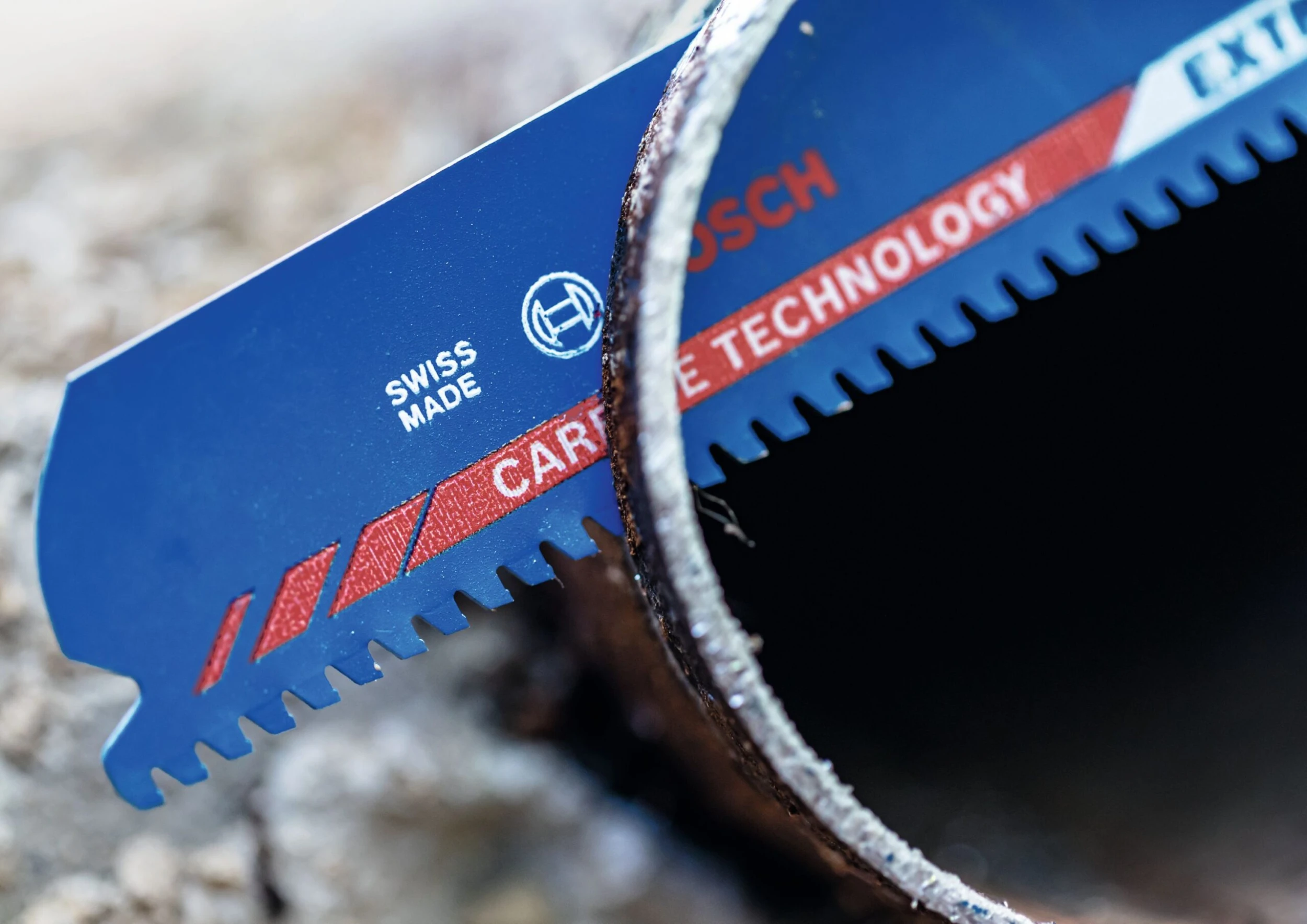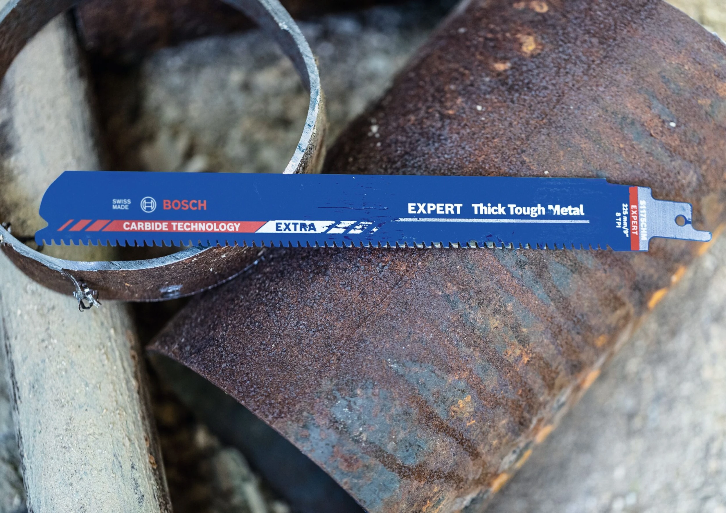 Ideal zum Schneiden von dickem, zähem Metall wie: Gusseisenrohr wie etwa Hauptwasserleitungen. Hochlegierter Stahl im Bauwesen und hochfester Stahl.Die erste Wahl für Arbeiter in Versorgungsunternehmen: langlebig und leistungsstark.Produkteigenschaften:Hält bis zu 100-mal länger als ein Bimetall-Blatt in robustem Material – Das Schneiden durch dickes Metall wie Stahlprofile oder schwere Gussrohre gehört wahrscheinlich nicht zu deinen Lieblingsarbeiten.Sanitärinstallateure, Renovierer und Abbrucharbeiter wissen alle, dass für diese harte Arbeit selbst mit einer Hochleistungs-Säbelsäge Schweiß und Muskelkraft erforderlich sind.Das Expert ‘Thick Tough Metal’ schneidet nicht nur dickes Metall, es bietet auch eine außerordentlich hohe Lebensdauer bei diesen härtesten Einsätzen.Durch die Bosch Carbide Technology hat das Blatt eine herausragende Lebensdauer.Die aus härtestem Metall bestehenden Zähne werden auf ein besonders robustes, breites Blatt aus Stahl mit hoher Materialstärke geschweißt – perfekt für gerade Schnitte und Widerstandsfähigkeit.Profis, die noch nie ein Bosch Carbide-Blatt verwendet haben, werden erstaunt sein, was das Bosch Expert ‘Thick Tough Metal’ Säbelsägeblatt alles aushält.Mit dem Bosch Expert ‘Thick Tough Metal’ Säbelsägeblatt findest du vielleicht sogar Gefallen am Schneiden von dickem Stahl und Gusseisen.Passend auf alle Säbelsägen mit S-Schaft.Technische Daten:Zahnteilung [mm] / TPI: 3 / 8Gesamtlänge [mm]: 150Gesamtlänge [Zoll]: 6Breite [mm]: 25Dicke [mm]: 1,25Werkstoff: CARBIDELieferumfang:1x Bosch EXPERT Thick Tough Metal S 955 CHC Slsägeblatt, 10 Stück
