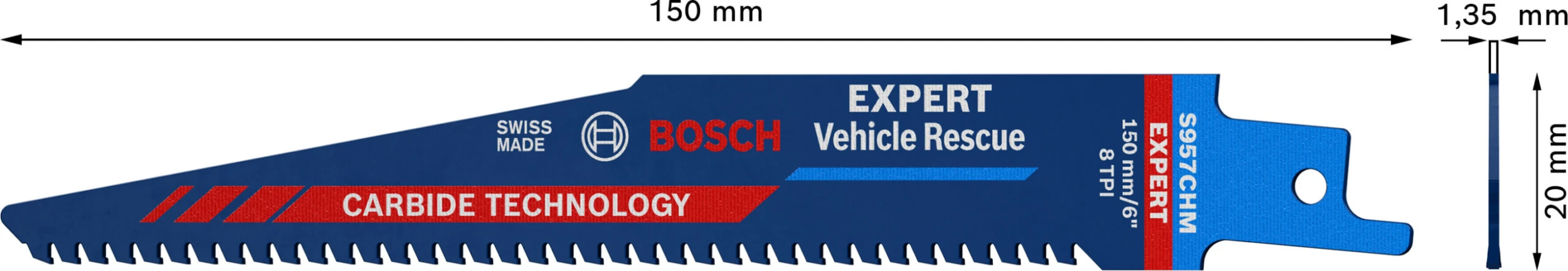 Ideal für Rettungsschnitte in ein Fahrzeug an einer Unfallstelle. Entwickelt für bestimmte Schnitte, die bei modernen Rettungstechniken üblich sind; zum Beispiel für das Schneiden in die B-Säule und dDie erste Wahl für Feuerwehrleute und Rettungskräfte: langlebig und zuverlässig.Produkteigenschaften:Hält bis zu 50-mal länger als ein Bimetall-Blatt in robusten Materialien – Bei Rettungsarbeiten an Fahrzeugen kann das schnelle Eindringen in ein Auto über Leben und Tod entscheiden.Rettungsdienste setzen zunehmend Säbelsägen als wertvolles Rettungswerkzeug ein.Sie brauchen jedoch ein wirklich gutes Sägeblatt, das modernen Automobilstahl zuverlässig durchschneiden kann.Das Expert ‘Vehicle Rescue’ ist für diese wichtige Aufgabe ausgelegt.Dieser Experte für das Zerlegen von Fahrzeugen bietet nicht nur ultrahartes Carbide in den Zähnen, sondern auch ein spezielles Spitzendesign, das es dem Blatt möglich macht, Tauchschnitte in Blech vorzunehmen.Es wird bei typischen Rettungsarbeiten eingesetzt, wie dem Schneiden eines Seiten- oder Dachzugangs zu den Passagieren.Die kurze S957CHM-Version ist ideal zum Entfernen von Windschutzscheiben, während die längere S1157CHM-Version für das Schneiden von A-, B- und C-Säulen aus verstärktem Stahl ausgelegt ist.Das mit der Bosch Carbide Technology gefertigte Bosch Expert ‘Vehicle Rescue’ Säbelsägeblatt schneidet moderne Fahrzeuge schnell und zuverlässig – und hilft dir, Leben zu retten.Passend auf alle Säbelsägen mit S-Schaft.Technische Daten:Zahnteilung [mm] / TPI: 3Gesamtlänge [mm]: 150Gesamtlänge [Zoll]: 6Breite [mm]: 20Dicke [mm]: 1,35Werkstoff: CARBIDELieferumfang:1x Bosch EXPERT Vehicle Rescue S 957 CHM Slsägeblatt, 1 Stück