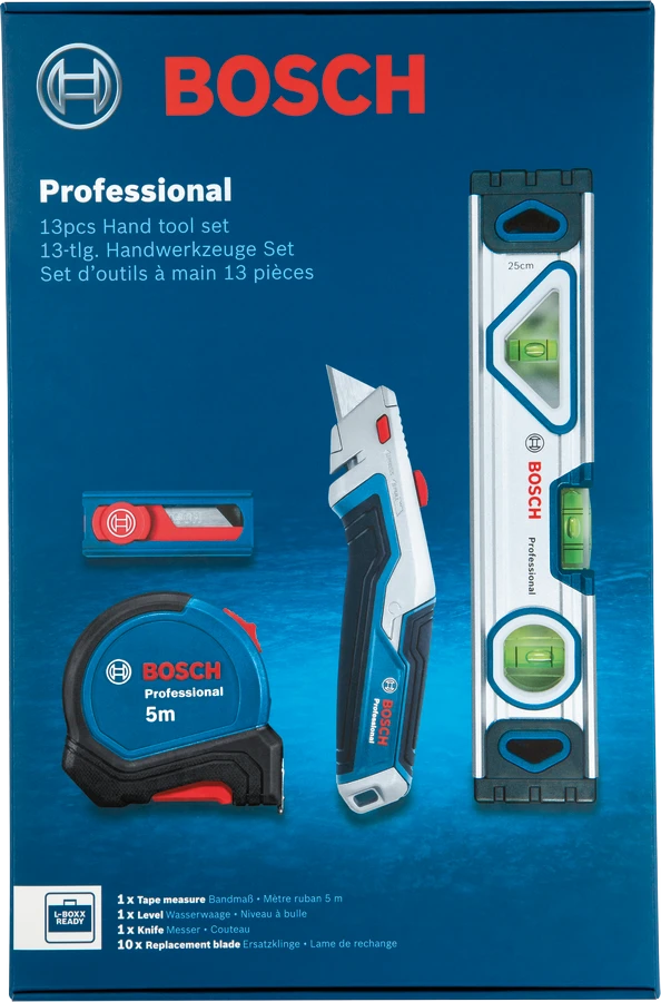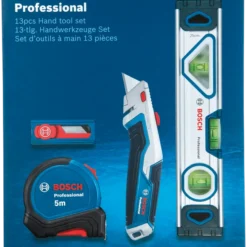 Produkteigenschaften:Langlebiges & vielseitiges klappbares UniversalmesserRobuste Bauweise dank widerstandsfähigem Aluminiumgehäuse, geeignet für verschiedene MaterialartenEinfache Langstreckenmessung bis zu 5 mEinfache Messung großer Entfernungen durch starken Magnethaken an MetalloberflächenPraktische WasserwaageWeicher Griff und ergonomische Form für optimale ArbeitsbedingungenTechnische Daten:Bestehend ausUniversalmesser (?1600A01V3H)Bosch Ersatzklingen Trapez VE 10 (1600A016ZH)Bosch Maßband 5 mBosch Wasserwaage 25 cm magnetisch RobustLieferumfang:1x Bosch Handwerkzeug-Set 13 tlg. Professional